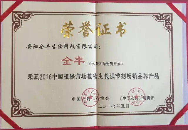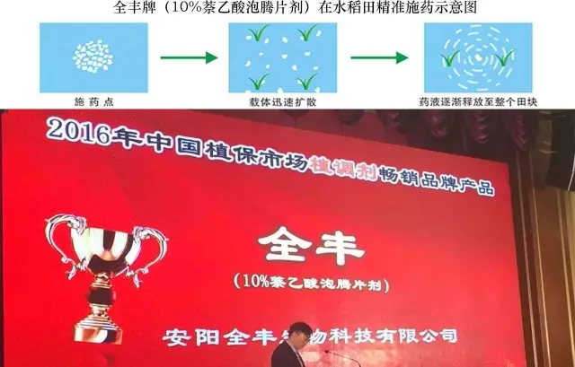 同時(shí),全豐牌10%萘乙酸泡騰片劑榮獲2016年中國植保市場植物生長調(diào)節(jié)劑暢銷品牌產(chǎn)品。日子美(20%赤霉酸可溶粉劑)榮獲2016年中國植保市場最具市場爆發(fā)力品牌產(chǎn)品。