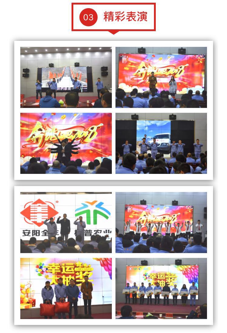 隆重的總結(jié)表彰活動結(jié)束后,以“奔跑吧2018”為主題的聯(lián)歡會拉開序幕。原藥分公司的一曲《我是中國人》唱出了全豐人的豪邁,太行培訓(xùn)學(xué)校表演的舞蹈《舞動青春》和制劑分公司表演的《新春舞會》有異曲同工之妙,博得現(xiàn)場陣陣掌聲,標普公司表演的小品《我是飛行員》把一個失戀青年加入飛防隊伍后的徹底蛻變刻畫得惟妙惟肖。飛防隊的小伙子們也帶來驚喜,太極拳表演柔中帶剛、虎虎生威,生產(chǎn)技術(shù)部的男女聲獨唱和財務(wù)部的二胡表演各具特色,活動現(xiàn)場的幸運抽獎環(huán)節(jié)更是讓現(xiàn)場歡呼聲和掌聲此起彼伏。歡笑聲中,全豐人告別了2017年,2018年我們攜手并進,再創(chuàng)輝煌!全豐人贏戰(zhàn)2018!加油干!